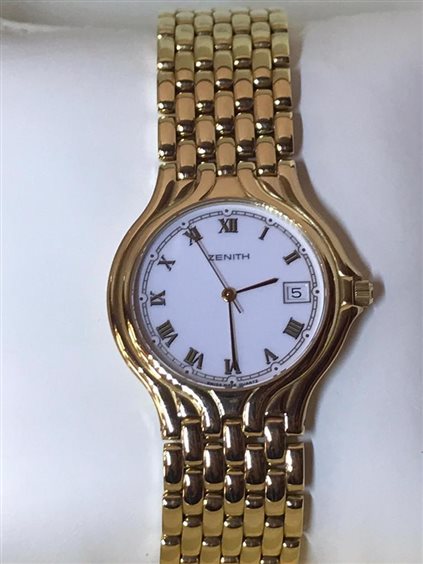 Orologio Zenith con movimento svizzero al quarzo, cassa e cinturino in oro giallo kt 18 , fondo bianco solo tempo con numeri romani e datario posizionato al numero 3, chiusura deployante in oro giallo.