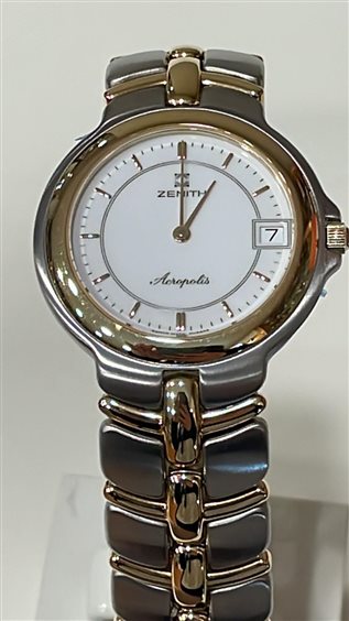 OROLOGIO ZENITH UOMO COLLEZIONE ACROPOLIS, CASSA E CINTURINO IN ACCIAIO BICOLORE, QUADRANTE FONDO BIANCO SOLO TEMPO CON DATARIO POSIZIONATO AL NUMERO 3. CHIUSURA DEPLAYANTE, MOVIMENTO SVIZZERO AL QUARZO.